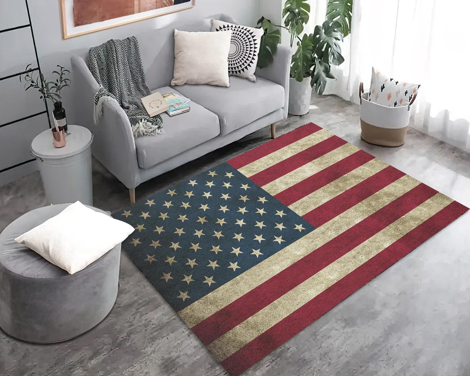 Layer different textures and patterns of red, white, and blue rugs to create depth and comfort. Start with a neutral base rug, then add smaller patriotic accent rugs or vintage flag-inspired pieces. This technique works particularly well in larger living rooms where you want to define different seating areas while maintaining the patriotic theme throughout.